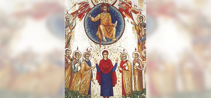 Ścianę centralną wykonał artysta rosyjski. Przedstawia ona Niebieskie Jeruzalem w kontemplatywnej wizji świętych Kościoła Wschodu i Zachodu, zgromadzonych razem wokół stołu w grupach po trzech dla wyrażenia uczestnictwa ludzi w miłości trynitarnej Boga. Człowiek uczestniczy w życiu Boga i może stać się podobny do Niego na tyle, na ile jest zdolny do więzi wspólnotowej.