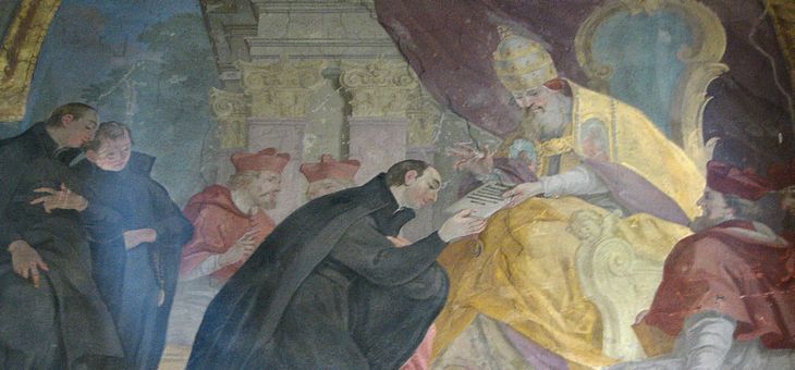 Inigo Lopez de Loyola był Baskiem z prowincji Guipuzcoa w Hiszpanii. Urodził się w r. 1491 na zamku w Loyoli. Chrzestne imię Inigo zamienił po wielu latach na imię Ignacy, pod którym jest powszechnie znany. Od młodości zaprawiał się do służby dworskiej i rycerskiej. Jak rycerz w służbie wicekróla Nawary bronił twierdzy Pampeluny gdzie został ciężko ranny (1521). Przeniesiony do rodzinnego zamku powoli wracał do zdrowia, a długie miesiące rekonwalescencji spędził na czytaniu jedynych książek jakie były w zamku: Żywotów Pana Naszego Jezusa Chrystusa oraz zbiorów żywotów świętych tzw. Złota legenda. Pod wpływem tej lektury i zastanawiania się nad sensem życia dokonała się w nim gruntowna przemiana. Inigo decyduje się na porzucenie kariery dworskiej i rycerskiego trybu życia, by oddać się na wyłączną służbę pod sztandar Króla królów, Jezusa Chrystusa. Po całonocnym czuwaniu i złożeniu oręża przed figurka Matki Bożej w Monserrat, udał się do Manresy i spędził tam 10 miesięcy na modlitwie i pokucie. Pod wpływem mistycznych przeżyć i własnych doświadczeń, które umiał trafnie analizować i oceniać, zrozumiał podstawowe zasady życia z Bogiem. Zaczął je spisywać ufając, że będą pomocne również w drodze do Boga. W ten sposób powstał pierwszy zarys książeczki Ćwiczeń duchownych, które potem przez wiele lat ulepszał i rozszerzał. Ćwiczenia duchowne, zatwierdzone w r. 1548 przez Papieża Pawła III, stały się skutecznym narzędziem odrodzenia i reformy w Kościele. Pragnienie większej chwały Bożej przez niesienie większej pomocy duszom skłoniło Iniga do podjęcia dalszej nauki w 33 roku życia, a następnie do studium filozofii i teologii w Paryżu. W czasie studiów pozyskał grupę przyjaciół, których potrafił zapalić tym samym pragnieniem apostołowania. Nie mogąc wyjechać do Ziemi Świętej dla nawracania niewiernych on i towarzysze oddali się do dyspozycji papieża, aby mógł ich posłać do tych prac, które uzna za najpotrzebniejsze w aktualnej sytuacji Kościoła. Nie chcąc jednak stracić miedzy sobą łączności postanowili utworzyć zakon. Ignacy napisał jego konstytucje i jako pierwszy generalny przełożony kierował rozrastającym się szybko zakonem. Umarł w Rzymie 31 lipca 1556 r.