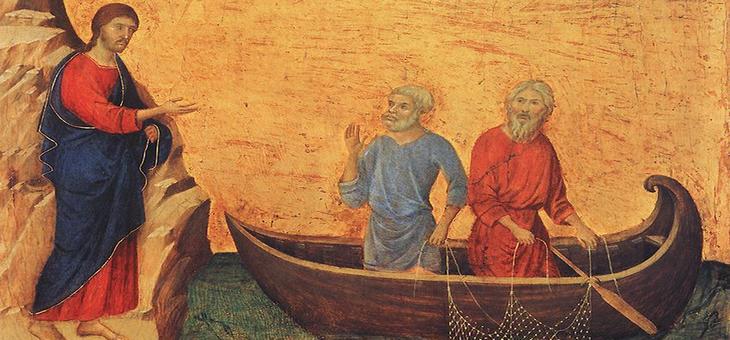 W porównaniu z Judeą kraina ta wydawała się mniej ważna i niezbyt religijna. Izajasz powiedział o niej, że jest to Galilea pogan (Mt 4, 15). A jednak w ten rejon Jezus skierował się ze swą misją. Przechodził obok Jeziora Galilejskiego, gdzie toczyło się życie Jego pierwszych uczniów, Szymona i Andrzeja. Jezus zastał ich przy pracy, jak zarzucali sieć w jezioro. Byli to prości cuchnący rybą ludzie. Ujrzał ich, przeniknął swoim spojrzeniem i głęboko wniknął w ich serca. Spojrzenie to zostało wzmocnione wypowiedzeniem słów kryjących tajemniczą moc: Pójdźcie za Mną, a uczynię was rybakami ludzi. Zostali zaproszeni, aby wyjść ze swojego świata i uwierzyć słowu Jezusa. Ich decyzja była natychmiastowa. Powołani, aby służyć – poszli za Nim!