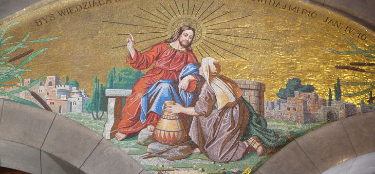 Zbawiciel przedstawiony jest jako Ten, który przekracza wszelkie bariery społeczne i kulturowe. Z misją głoszenia królestwa Bożego dotarł do Samarii – terytorium omijanego przez prawowiernych żydów. W czasie działalności Jezusa Palestyna dzieliła się na trzy jednostki terytorialne. Na północy była Galilea, na południu Judea, a między tymi krainami leżała Samaria. W rozwidleniu dróg w pobliżu miasta Sychar znajduje się studnia Jakuba i kupiona kiedyś przez niego działka ziemi, którą później przekazał Józefowi. Po śmierci Józefa w Egipcie przywieziono go tutaj i w tej ziemi pogrzebano. Żydzi bardzo sobie cenili to miejsce. Studnia była głęboka na ponad 30 metrów. Nikt nie mógł nabrać z niej wody, jeśli nie miał z sobą czerpaka. Dlatego Jezus prosił o wodę kobietę, która miała uwiązane na linie wiadro ze skór. Jej zdziwienie było podwójne: że z nią rozmawiał i że poprosił ją o wodę.