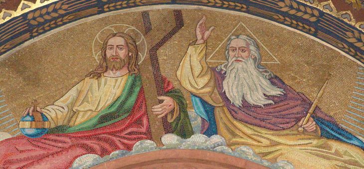 Mozaika ma kształt łuku i dobrze wypełnia przestrzeń powstałą pomiędzy niszą ołtarzową a sklepieniem kaplicy. Kształt mozaiki, nawiązujący do łuku tęczy, przywołuje biblijną ideę tęczy wokół tronu Bożego: Doznałem natychmiast zachwycenia: A oto w niebie stał tron i na tronie ktoś zasiadał. A Zasiadający był podobny z wyglądu do jaspisu i do krwawnika, a tęcza dokoła tronu – podobna z wyglądu do szmaragdu (Ap 4,2-3). Centrum mozaiki stanowią dwie męskie postacie zbliżone do siebie, majestatycznie usytuowane w dostojnej pozie siedząco-leżącej. Osoby te różnią się wyglądem, wiekiem, strojem i atrybutami, a odziane są w powłóczyste szaty. Jest to artystyczna wizja Boga Ojca i Jego Jednorodzonego Syna – Jezusa Chrystusa. Przedwieczny i Jego Syn zostali przedstawieni na tle złocistej kuli, przypominającej tarczę słoneczną, od której rozchodzą się regularne białe promienie, docierające aż do płynących po niebie białych kłębiastych obłoków. U początków świata wszechmoc Boga stworzyła obłoki, by były błogosławieństwem dla ziemi. To one chronią żyjące na niej byty przed prażącym słońcem oraz obdarzają je życiodajnym deszczem. W Biblii obłok jest świętym symbolem, siedzibą i widzialnym znakiem Bożej obecności: Tron mój na słupie z obłoku (Syr 24,4). Kłębiące się chmury są tajemniczym obrazem niewidzialnego nieba i Boskiego Majestatu, a w tym mozaikowym przedstawieniu są tłem służącym jakby do obramowania postaci Chrystusa i Boga Ojca.
