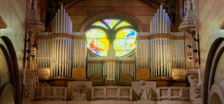 Chór w bazylice urzeka nie tylko barwą instrumentu, ale i piękną kamienną balustradą, zamkniętą po bokach przy ścianie wyrzeźbionymi w kamieniu roślinnymi kompozycjami. Balustrada składa się z trzech prostokątnych segmentów z jasnego piaskowca, lekko wygiętych po łuku. Na każdy z nich składają się trzy ażurowe kwatery ozdobione motywem dorodnego winnego grona oraz pnączy winnej latorośli. Każda kwatera ma osiem okrągłych prześwitów, których krawędzie są ozdobione płaskorzeźbą kwiatów słonecznika, a ażurowe otwory łączy dekoracyjny element. Segmenty są oddzielone od siebie dwoma dużymi kamiennymi konsolami, na których znajdują się dwa posągi. Przedstawiają one z lewej strony klęczącą młodą kobietę, a po prawej stronie klęczącego młodego mężczyznę.